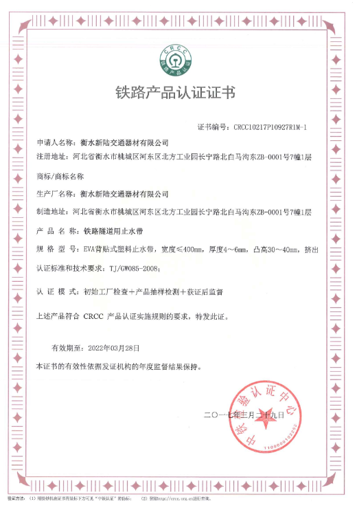 我公司產(chǎn)品經(jīng)中鐵檢驗(yàn)認(rèn)證中心(原中鐵鐵路產(chǎn)品認(rèn)證中心)(簡稱“CRCC”)一系列檢驗(yàn),產(chǎn)品質(zhì)量過硬完全達(dá)到鐵路產(chǎn)品、城軌裝備要求,現(xiàn)已順利獲得CRCC證書。后附防水板、止水帶CRCC證書詳情。