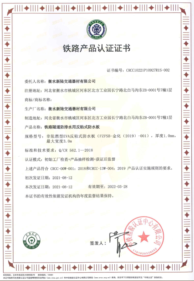 2021年5月15日至17日,我公司進(jìn)行了為期兩天半的鐵路隧道防排水用反粘式防水板的現(xiàn)場認(rèn)證。認(rèn)證老師們對生產(chǎn)、技術(shù)、品控等方面進(jìn)行了嚴(yán)格的審查工作,經(jīng)過各個部門的共同努力,順利完成了現(xiàn)場審核。經(jīng)過了現(xiàn)場取樣、檢測、評定一系列工作后,終于于8月份取得了由中鐵檢驗認(rèn)證中心有限公司公司頒發(fā)的鐵路產(chǎn)品認(rèn)證證書。這對于我們來說是新的機(jī)會,新陸的春天要來了。期待我們盡快取得好的成績。
